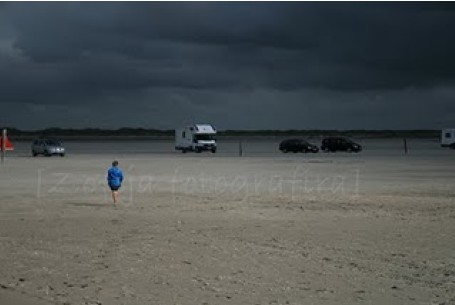 Odločimo se pogledat otok ROMO, na katerega se pride po nekem nasipu. V bistvu ni otok in je. Zelo zelo piha. S kemperjem se odpeljemo čisto na plažo, ker je že veliko drugih avtomobilov in kemperjev. Veliko jih spušča zmaje in kajta. Ker tako piha z Marušo in psom ostanemo v avtodomu. Damir in Gašper se pa odpravita skakat po plaži. Tako piha, da mivko prav reže v kožo.