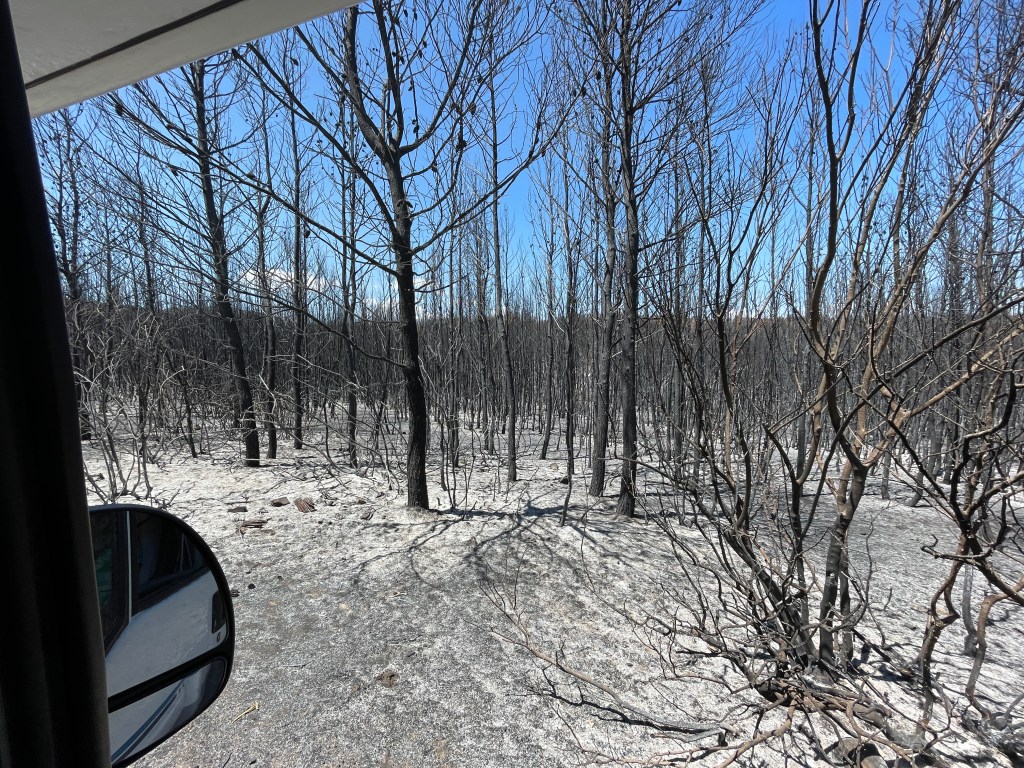 Po vseh peripetijah, smo odšli naprej in se kar dolgo in mučno vozili po notranjosti Grčije, saj nismo želeli plačevati drage avtoceste. V Grčiji namreč avtodom po avtocestah štejejo kot tovornjak. Pot je bila mučna predvsem zato, ker smo dojeli razsežnosti požara, ki je resnično pokosil cele hribe gozda. Pogled na ožgana drevesa je bil res žalosten.