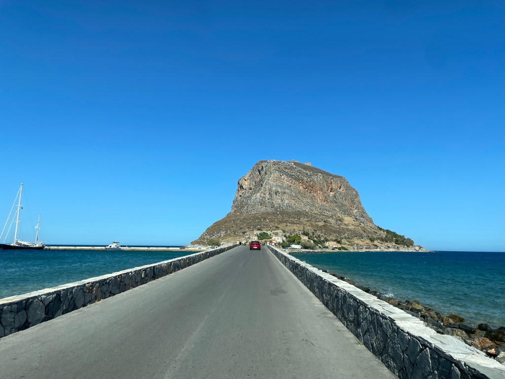 MONEMVASIA – lepo staro mesto na otočku. Parkirali smo sicer tik za mostom, vendar smo prijazno dobili listek, da je za avtodome parkirišče malo ven iz mesta, na pomolu, 36.6823 23.0385. Tam smo tudi prespali.
