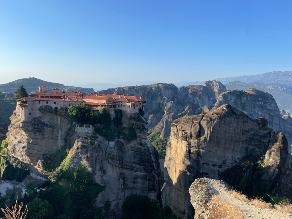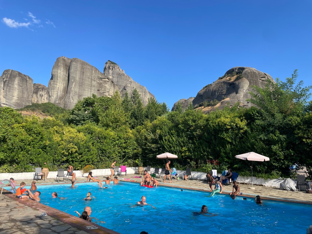 V KALABAKI ni dovoljeno nikjer prenočevati, zato smo šli v kamp. Res lušten kamp z bazenom in pogledom na mogočne Meteore. Tam smo srečali še drugo prijazno bivšo sodelavko. Zopet smo preživeli čudovit večer, naslednji dan smo se pa odpravili na ogled Meteor. Lahko si ogledate več samostanov, mi smo se odločili za enega. Parkirali smo na 39.7267 21.6280, smo imeli srečo, da smo dobili prostor, smo pa odšli kar zgodaj zjutraj. Tam smo najprej pojedli zajtrk, potem se pa odpravili na ogled samostana. Na vrsto smo čakali eni uro, na soncu, ampak okej, če smo že tukaj, pač to paše zraven. Ženske moramo imeti dolgo krilo in pokrita ramena. Samostan pa….zanimivo. Vidiš enkrat, ne rabiš videt spet 🙂