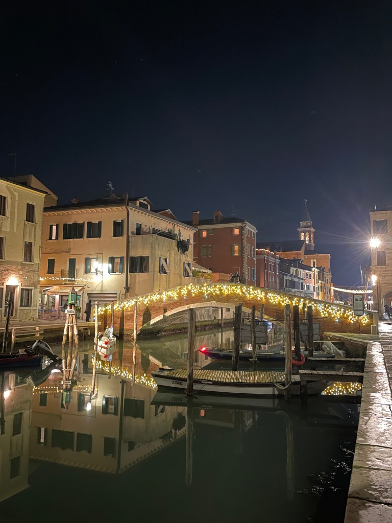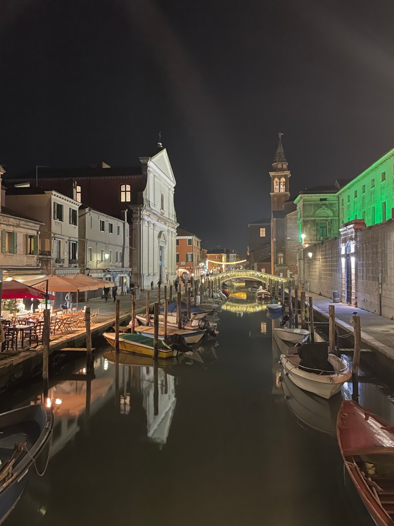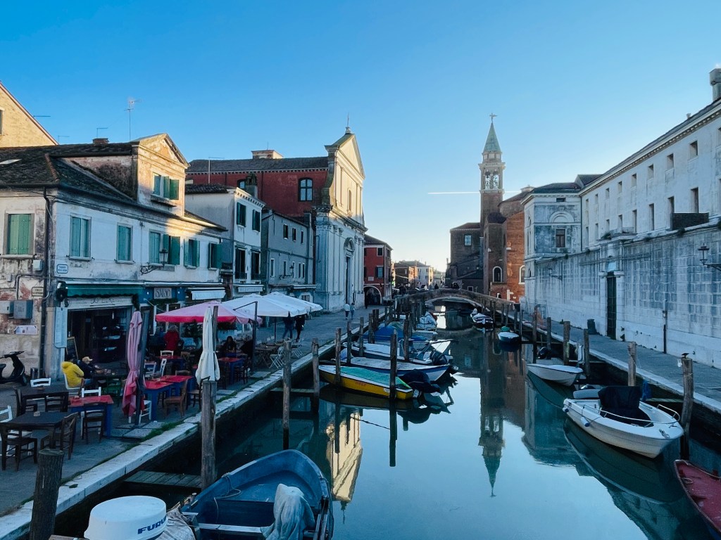 Ker je PZA čisto poln, avtodom pustimo v družbi še drugih kar na P tik pred PZAjem. Cena je ista – 6€ / dan. Do centra CHIOGGIE ni daleč, nekje 15 minut hoje. Mestece je krasno. Mini Benetke se mu reče. Polno kanalov in mostov. Res je lepo, tako da se zvečer odločiva, da greva še enkrat na sprehod. Na Aperol in kozarec vina.